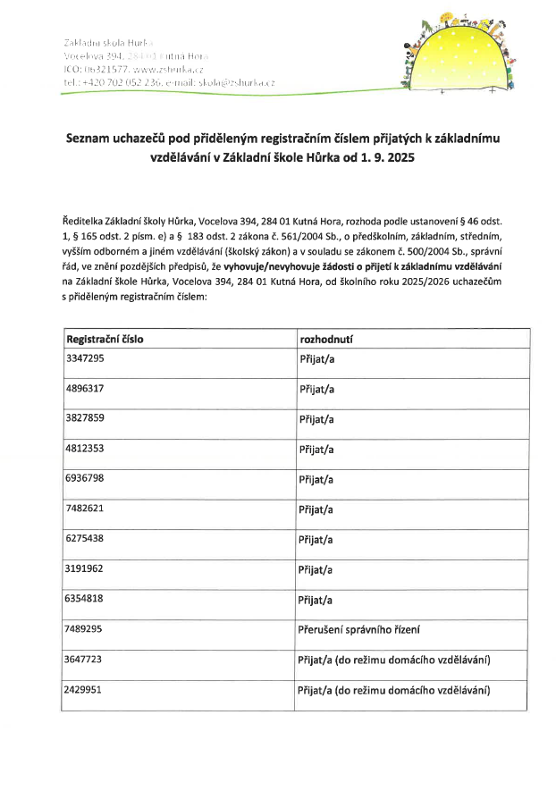 Pro děti na 1. a 2. stupni ZŠ dle § 41 zákona č. 561/2004 Sb., o předškolním, základním, středním, vyšším odborném a jiném vzdělávání (školský zákon), ve znění účinném od 1. 9. 2016, případně dle § 38 v režimu zahraničního vzdělávání, nemáme naplněnu kapacitu. Jde o možnost vzdělávat se individuálním způsobem doma, v komunitní škole či jiným způsobem s přezkoušením dvakrát za školní rok u nás ve škole. Více informací zde