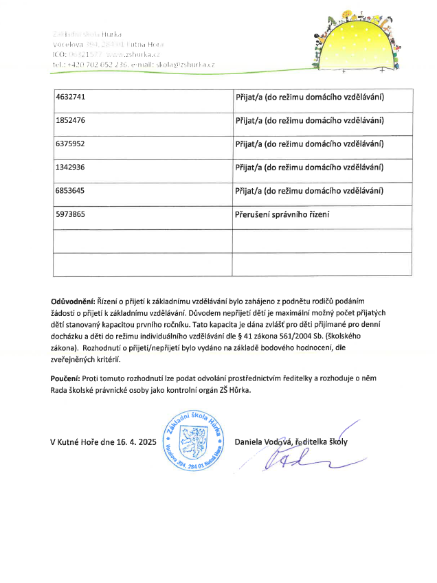 V první třídě máme dvě volná místa, ve třídě druhé jedno volné místo a ve třetí třídě na denním studiu máme tři volná místa. Do čtvrté třídy můžeme přijmout tři děti a v šesté třídě máme jedno místo volné.