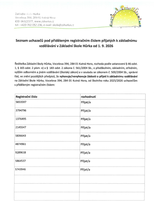 ROZHODNUTÍ O PŘIJETÍ DO PRVNÍHO ROČNÍKU 2026/2027